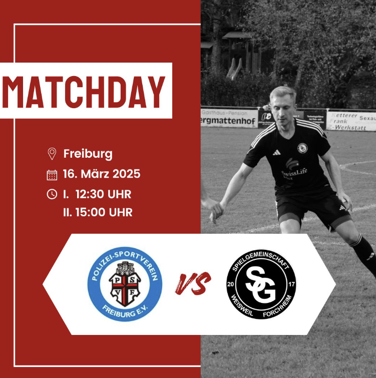 Endlich geht es wieder los! Nach einer intensiven Wintervorbereitung startet die SG Weisweil/Forchheim am kommenden Wochenende in die Rückrunde der Kreisliga A. Zum Auftakt wartet mit dem Polizei-Sportverein Freiburg direkt eine anspruchsvolle Aufgabe auf unsere Herren. Die Gastgeber belegen aktuell den 6. Tabellenplatz und konnten bereits das Hinspiel im Läger knapp mit 0:1 für sich entscheiden. Elf Punkte trennen beide Mannschaften derzeit in der Tabelle, doch die SG hat in der Vorbereitung hart gearbeitet und wird alles daransetzen, dem Favoriten ein Bein zu stellen. Ziel ist es, sich für die knappe Hinspielniederlage zuhause zu revanchieren. Mit Leidenschaft und mannschaftlicher Geschlossenheit soll der erste wichtige Schritt Richtung Klassenerhalt gemacht werden.