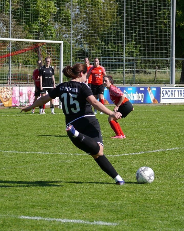 Einige Ausfälle, eine Sperre und der große Platz in Weisweil führten zu Beginn der Partie zu Schwierigkeiten. Doch es dauerte nicht lange, bis Ordnung und Konzentration zurück auf den Platz kehrten. Die Offensive der Gastgeberinnen zeigte ihre Stärken im Spielaufbau und schnellen Umschaltspiel. So kam es, dass sich das Spiel häufig im gegnerischen Strafraum abspielte. Als der Schiedsrichter in der 19. Spielminute einen Eckball pfiff, schnappte sich Nele Klosa den Ball und verwandelte diese direkt ins Tor. Erleichterung zeigte sich auf den Gesichtern der SG – doch nachlassen war keine Option. Bis zur Halbzeit entwickelte sich ein ausgeglichenes Spiel, da auch die Gäste keineswegs zu unterschätzen waren und immer wieder in die gegnerische Hälfte eindrangen. Doch entweder die Abwehrkette oder Kapitänin Mößner verteidigte souverän.