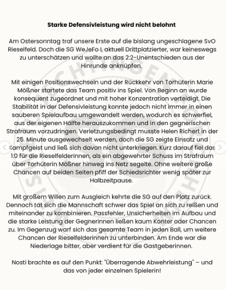 In der zweiten Halbzeit zeigte die SG WeJeFo ein anderes Gesicht. Der Wille, mindestens das Unentschieden zu halten und den vierten Platz zu sichern, war nun deutlich spürbar. Mit vollem Einsatz warf sich jede Spielerin in die Zweikämpfe, das Team trat mutiger auf und spielte sich vermehrt Torchancen heraus. Großchancen von Mia Thielmann und Angi Braun blieben jedoch ungenutzt. In der Defensive blieb die SG aufmerksam und verteidigte mehrere gefährliche Ecken der Freiburgerinnen souverän. Bis zur letzten Minute entwickelte sich ein kräftezehrender Kampf, der jeder Spielerin alles abverlangte. Der lang ersehnte Abpfiff besiegelte schließlich ein ausgeglichenes Spiel und ein verdientes Remis.