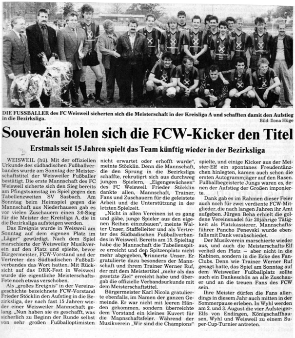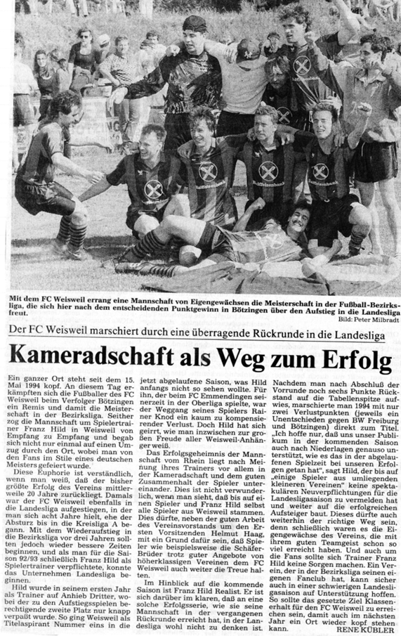 Werner Ruf hatte in dieser Zeit eine junge Mannschaft geformt, von deren Teamgeist und auch Vereinszugehörigkeitsgefühl der Verein noch lange profitieren sollte. Als Nachfolger im Traineramt kam Spielertrainer Franz Hild nach Weisweil. In die Saison 93/94 startete der FC Weisweil als Meisterschaftsfavorit. Die Vorrunde beendete man auf dem fünften Tabellenplatz – die Meisterschaft rückte in weite Ferne. Jedoch ließ eine unglaubliche Rückrundenserie den Traum in Erfüllung gehen. Am 15. Mai 1994 stand Weisweil Kopf. Am letzten Spieltag hatte man, beim direkten Verfolger Bötzingen, vor 1.100 Zuschauern den entscheidenden Punkt erkämpft. Somit machte man dem Verein zum 70. Vereinsjubiläum das schönste Geschenk. Nach 20 Jahren stieg man erneut in die Landesliga auf.