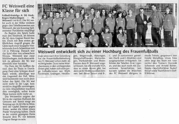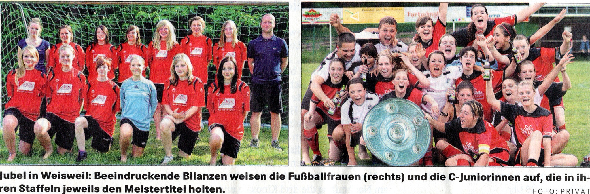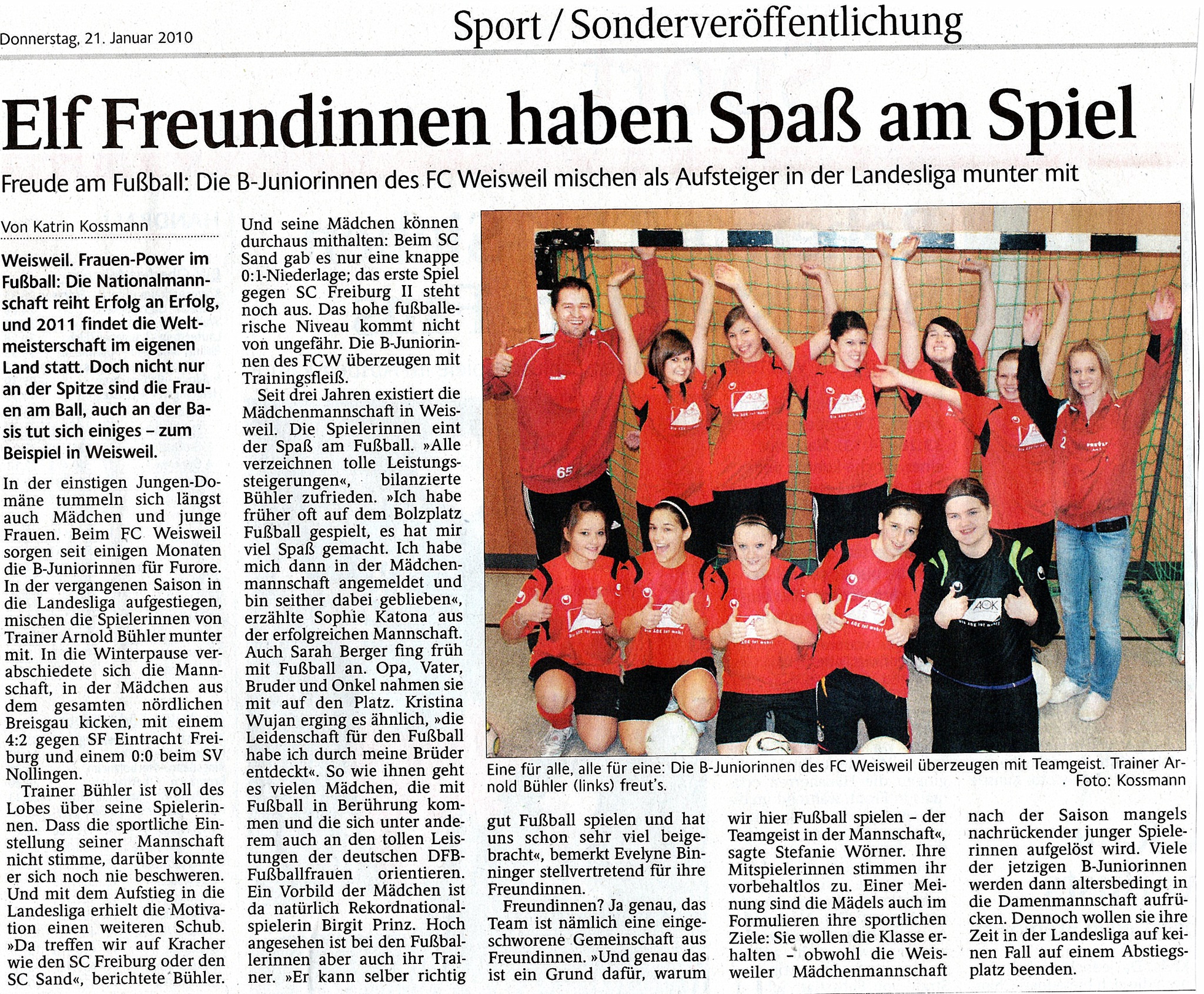 Am 14. November 2009 war ein großer Tag für unsere B-Juniorinnen. Die Gegnerinnen des SC Freiburg traten in Weisweil an. Presseschlagzeile: “Die B-Juniorinnen des FC Weisweil mischen in der Landesliga munter mit“. Zu dieser Zeit spielten in unserem Team Mädchen aus 10 verschiedenen Ortschaften. Die D-Juniorinnen waren derzeit Tabellenführer der Kleinfeldstaffel 1.