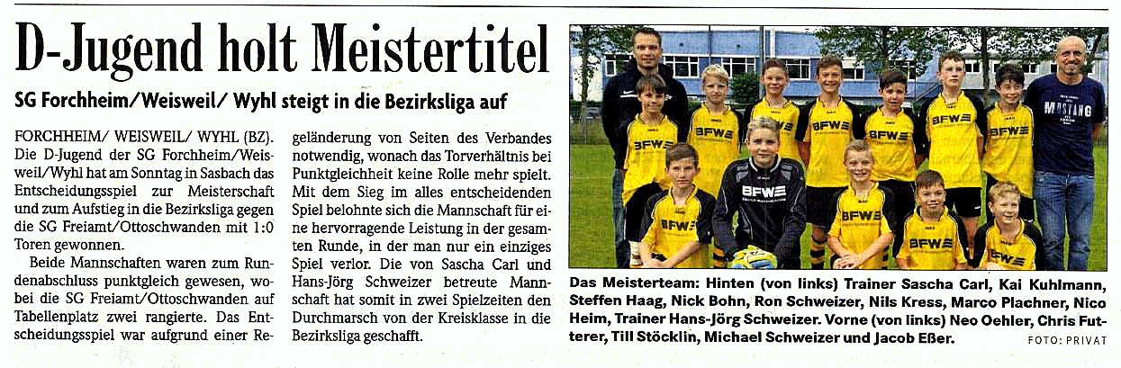In der Saison 2014/15 erkämpfte sich die D-Jugend SG Forchheim/Weisweil/Wyhl im Entscheidungsspiel den Meistertitel und stieg in zwei Jahren von der Kreisstaffel in die Bezirksliga auf. Auch hier sieht man wieder bekannte Gesichter von Spielern, die heute (2023) bei den Aktiven Herren im Team mit dabei sind. (K. Kuhlmann, S. Haag, N. Kress, T. Stöcklin, J. Eßer, nicht auf dem Bild waren R. Schneider und L. Schieble). Spielbericht siehe im folgenden Zeitungsbericht.