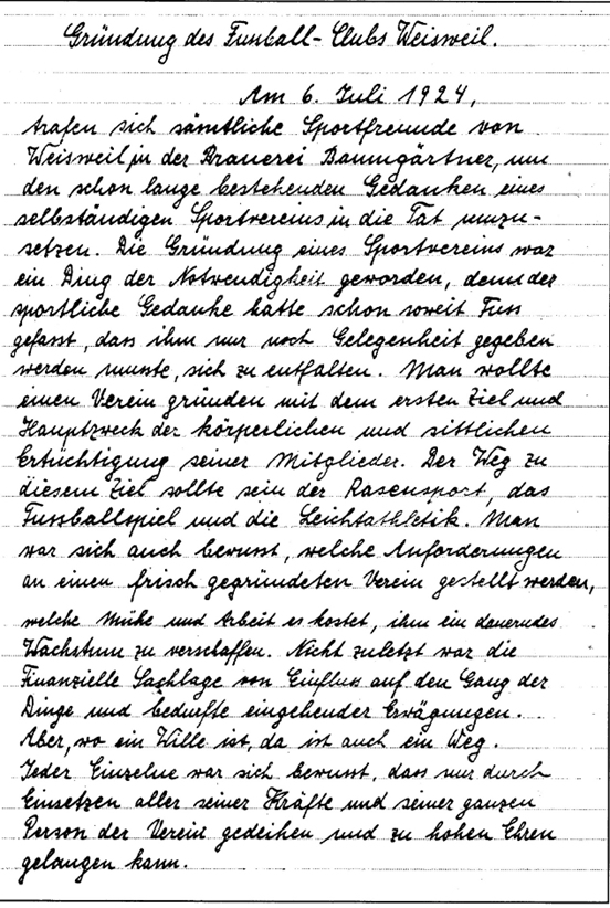 In Weisweil wird eigentlich seit 1919 Fußball gespielt, denn da erwachte der Turnverein nach dem ersten Weltkrieg zu neuem Leben. Dem damals in unserer Gemeinde wirkenden Hauptlehrer Zimmermann war es eigentlich zu verdanken, dass das zum Volkssport gewordene Fußballspiel auch in Weisweil begeisterte Anhänger fand. Eine Abteilung Fußball wurde dem Turnverein angegliedert. Als Übungsplatz wurde von der Gemeinde das „Läger“ zur Verfügung gestellt, ein Gelände, das einst der Aufbereitung von Hanf diente. Die Männer der ersten Stunde hatten ein hartes Stück Arbeit zu vollbringen, bis sie ihren verhältnismäßig kleinen Sportplatz hergerichtet hatten. Mit dem Übungsbetrieb wurde begonnen und bald konnte man sich mit anderen Vereinen auf dem grünen Rasen messen.
