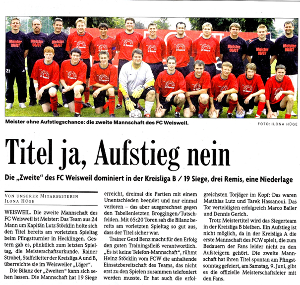 „…Es kribbelt schon ein wenig…“ so Trainer G. Jakob im BZ Interview am 04.06.2008, dem Vortag zum ersten Aufstiegsspiel zur Bezirksliga Freiburg im Weisweiler Läger gegen die Sportfreunde Winden. Der FCW stand bereits früh in der Saison als Teilnehmer an der Aufstiegsrunde fest.
